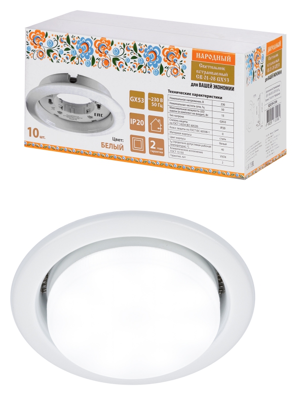 Светильник встраиваемый СВ 01-08 GX53 220 В 50 Гц, белый, 10 шт/уп, Народный | код SQ0359-0104 | TDM НАРОДНЫЙ