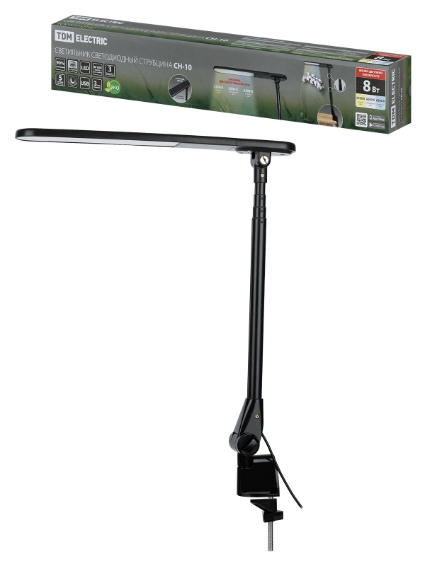 Светильник светодиодный струбцина СН-10, 8 Вт, телескопич., сенс-димм, 2700-6500 К, USB, черный, TDM | код SQ0337-0167 | TDM