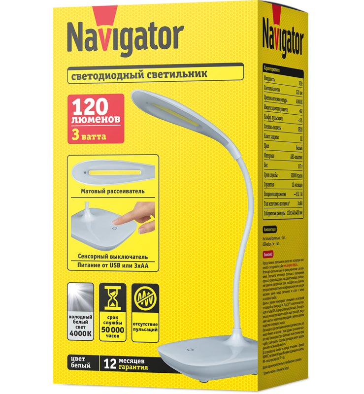 Светильник светодиодный настольный 82 983 NDF-D031-3W-4K-WH-LED 3Вт 4000К 120лм USB/3хAA на основании бел. Navigator 82983