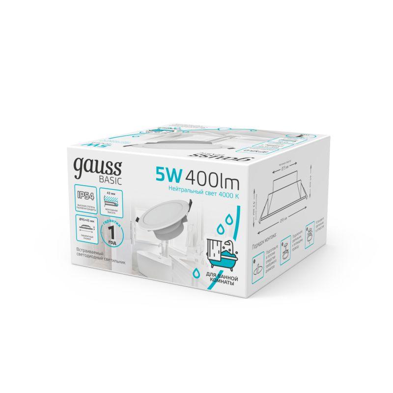 Светильник светодиодный Basic Downlight 5Вт 4000К IP54 400лм 210-240В 90х44 круг бел. GAUSS 9033420205