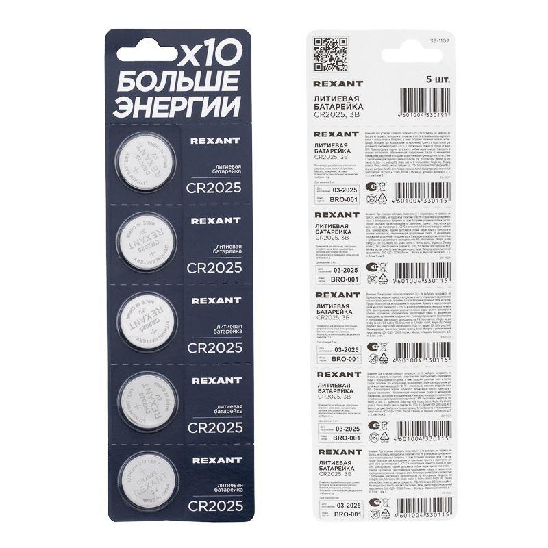 Элемент питания литиевый CR2025 3В (блист.5шт) Rexant 39-1107